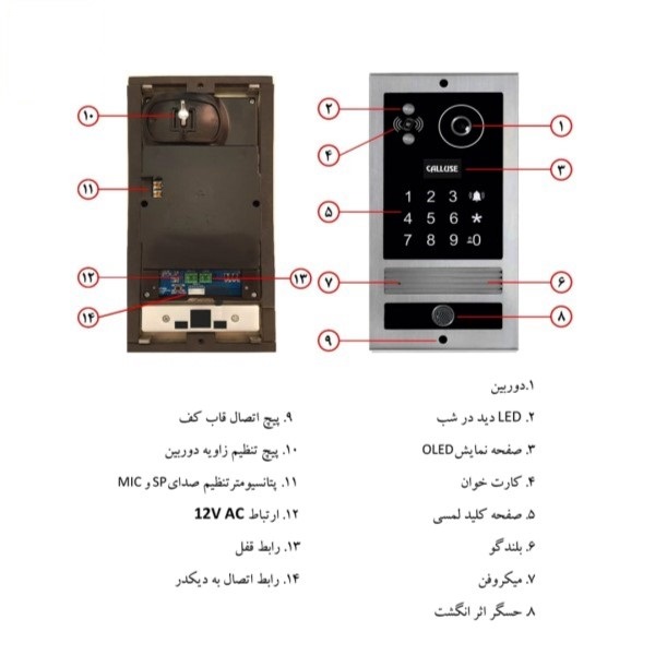 دارای صفحه نمایش OLED و منوی کاملا فارسی دارای صفحه کلید لمسی با عملکرد عالی بدون اختلال حتی در هوای بارانی عمق دید در شب عالی با استفاده از شتاب دهنده نور LED امکان بازکردن درب توسط اثر انگشت ، رمز ورود و نیز با استفاده از تگ یا کارت امکان افزودن 300 اثر انگشت و حذف واحدی و کلی اثر انگشت ها بدون نیاز به کد دهی و در صورت تمایل امکان تعیین شماره دلخواه برای واحدها امکان استفاده از مانیتورهای 4 سیمه و 5 سیمه معمولی آنالوگ مقاوم در برابر رطوبت و گرد و غبار نصب و راه اندازی بسیار آسان قابلیت استفاده تا 120 واحد ارتباط مستقیم با نگهبانی